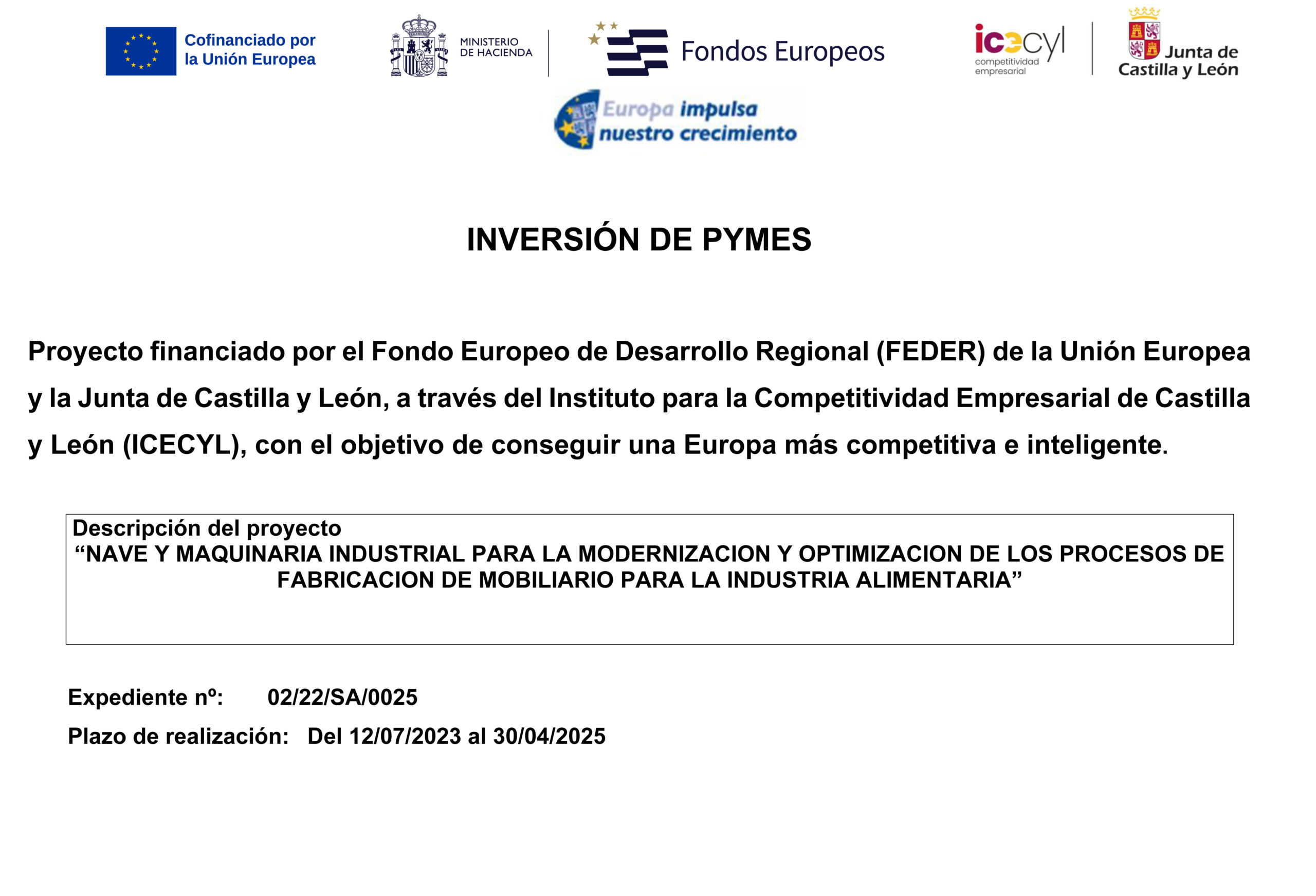 INVERSIONES DE PYMES. Nave y maquinaria industrial para la modernización y optimización de los procesos de fabricación de mobiliario para la industria alimentaria.